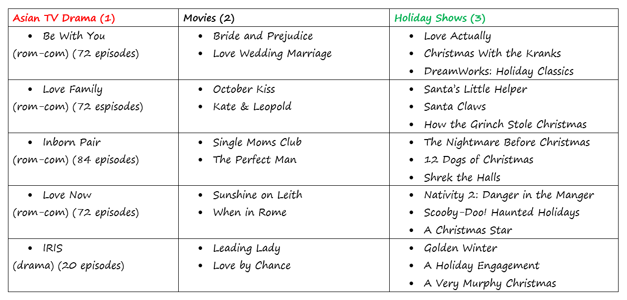 This time of year I take on the 1, 2, 3 approach to series-movie pairing. 1 Asian TV Drama, 2 Cheesy Rom-Coms, 3 Holiday Movies or Specials.